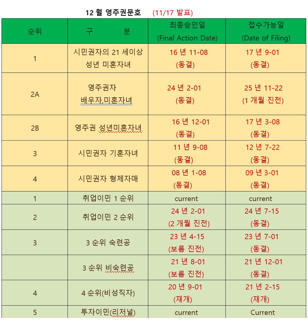 영주권자의 배우자와 미성년 자녀들이 대상인 2A 순위의 최종 승인일은 2024년 2월 1일에서 멈춘 반면 접수가능일은 유일2025년 11월 22일로 유일하게 1개월 나아갔다