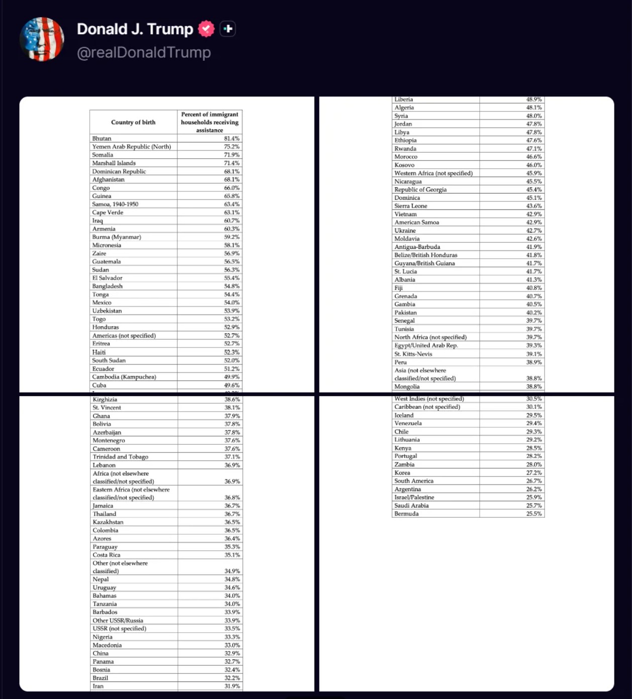 도널드 트럼프 대통령은 트루스 소셜에 미국의 웰페어 혜택에 의존하고 있는 국가들의 명단을 공표했다