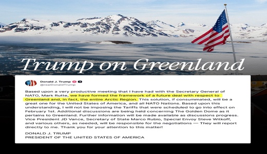 스위스 다보스 포럼에 직접 참석했던 도널드 트럼프 대통령은 “그린란드 인수에 무력사용은 없다”라고 천명한데 이어 나토동맹들, 유럽 우방들과 그린란드에 관한 프레임워크, 즉 기본 합의틀을 타결 지었다고 전격 발표했다